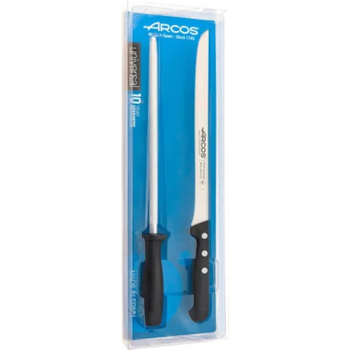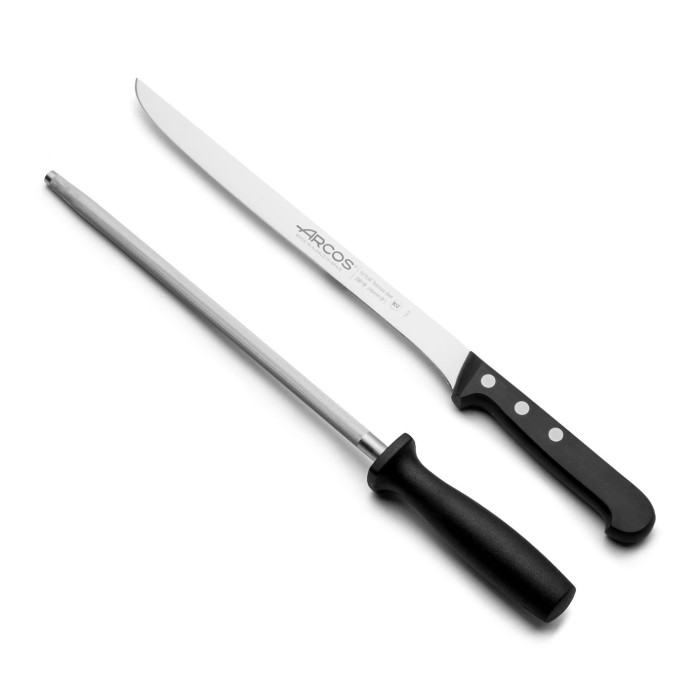 Профессиональный набор Arcos Universal, включающий нож для нарезки хамона длиной 24 см и точило 23 см, предназначен для обеспечения безупречного качества нарезки. Продукция испанского бренда ARCOS известна своей прочностью, точностью и удобством в использовании.