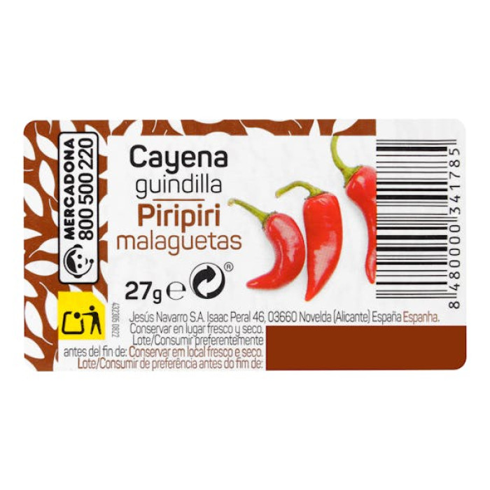 Кайенский перец цельный сушеный (Cayena guindillas) от ТМ Hacendado (27 г) — это высококачественная пряность, которая ценится за свою высокую и чистую остроту. Перец идеально подходит для тех, кто желает добавить интенсивной пикантности своим блюдам. Использование цельных сушеных стручков позволяет контролировать остроту и постепенно насыщать ароматом масла, уксусы или маринады. Это незаменимый ингредиент для испанской, мексиканской и азиатской кухни, идеальный для блюд из мяса, бобовых, а также для приготовления пикантного оливкового масла.