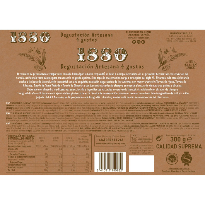 Каждый туррон в наборе имеет уникальный вкус от классического с миндалем до эксклюзивных вариаций с другими ингредиентами. Это отличный подарок для гурманов и ценителей оригинальных сладостей. Туррон ассорти от 1880 станет украшением любого праздника и настоящим открытием для ценящих высококачественные десерты из Испании.